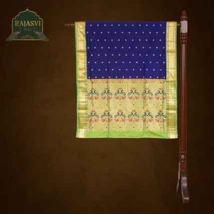 Pallavini, Paisley Butti also known as “badaami” or “mango-shaped” motif is a traditional and timeless design. These motifs add a graceful and classy charm to the saree. The classic Paithani border combined with a simple yet elegant pallu enhances the beauty of the Paisley butti, giving the saree a subtle and sophisticated look.