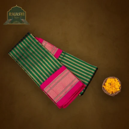या प्रकारात पारंपरिक पद्धतीने हातमागावर रेशमी धाग्यांनी विणलेले निवडक डिझाईन्स, उत्कृष्ट रंगसंगती आणि सूक्ष्म नक्षीकाम यांचा सुंदर मेळ साधलेला असतो. Silk Mark of India हे प्रमाणपत्र या साडीच्या अस्सल रेशीम वापराची अधिकृत हमी देते.