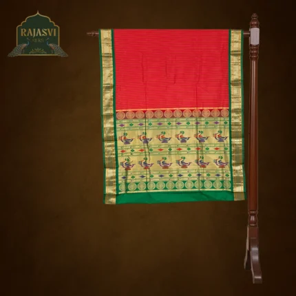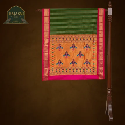 The pallu & border of Hansaraghavi Paithani are adorned with intricate motifs of birds such as the parrot & the swan, symbolizing beauty and grace. This saree is woven using special techniques like “kadiyal” (interlocking weaving), giving it a unique reversible finish making both sides of the saree equally beautiful. The result is a truly elegant & sophisticated Paithani that reflects timeless heritage.