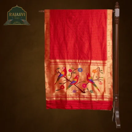 रंगरेखा या पैठणीच्या मुख्य अंगावर (Body) चौकोनी ठिपके किंवा चौकोनी डिझाइन विणलेली साडी. प्रत्येक चौकटीत असलेल्या नाजूक बुट्टी किंवा सोनरी जरीच्या सजावटीमुळे साडी उठावदार दिसते. ही पैठणी पूर्णतः हातमागावर (Handloom) विणलेली असते.
