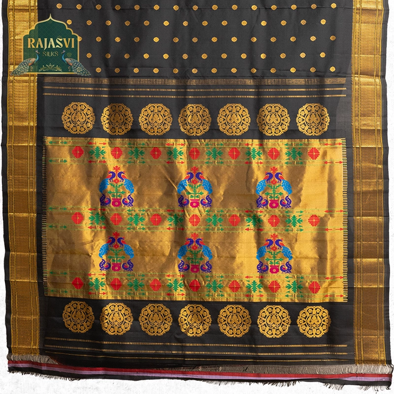 We use only natural, high-quality yarns — pure silk and pure cotton — to create the rich texture and durability that define a true Paithani saree.