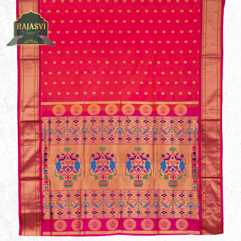 We use only natural, high-quality yarns — pure silk and pure cotton — to create the rich texture and durability that define a true Paithani saree.