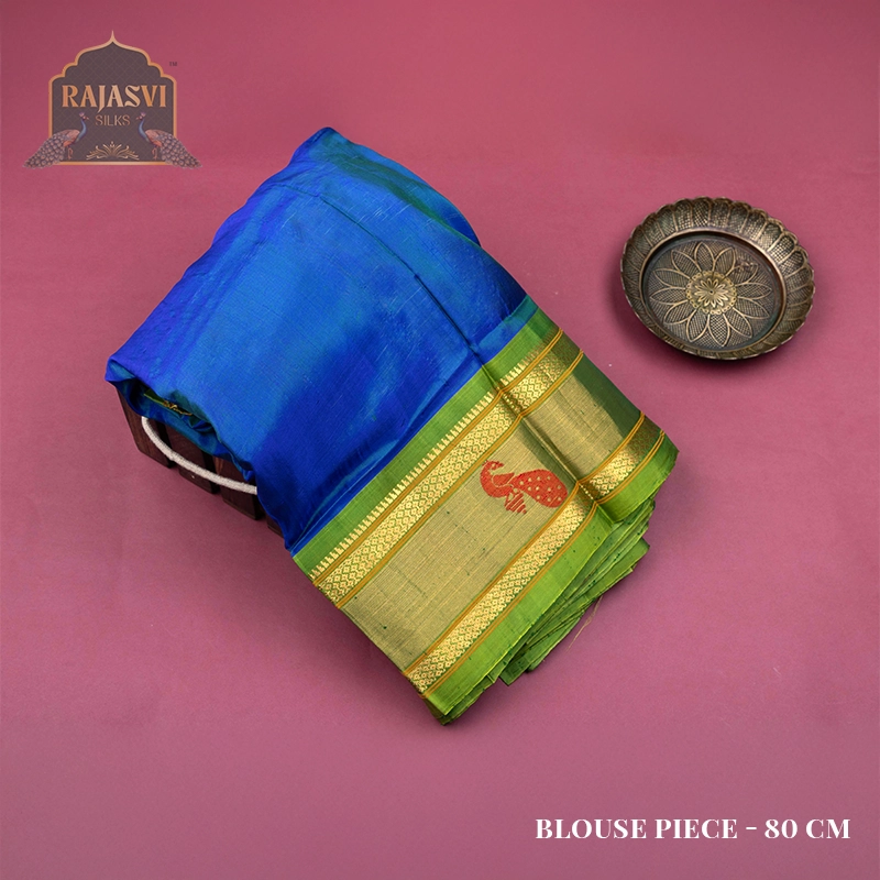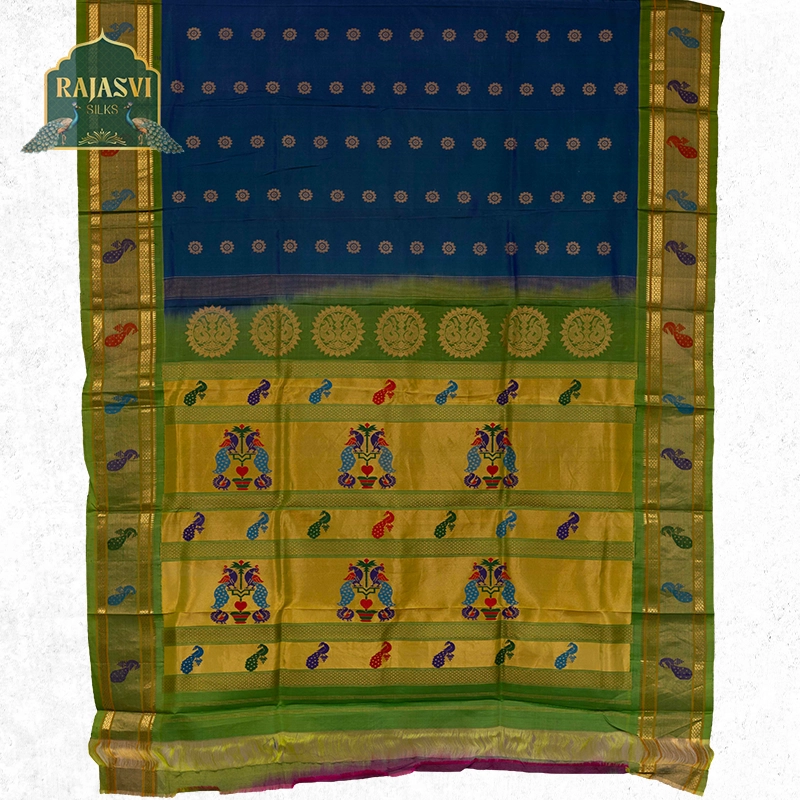 We use only natural, high-quality yarns — pure silk and pure cotton — to create the rich texture and durability that define a true Paithani saree.