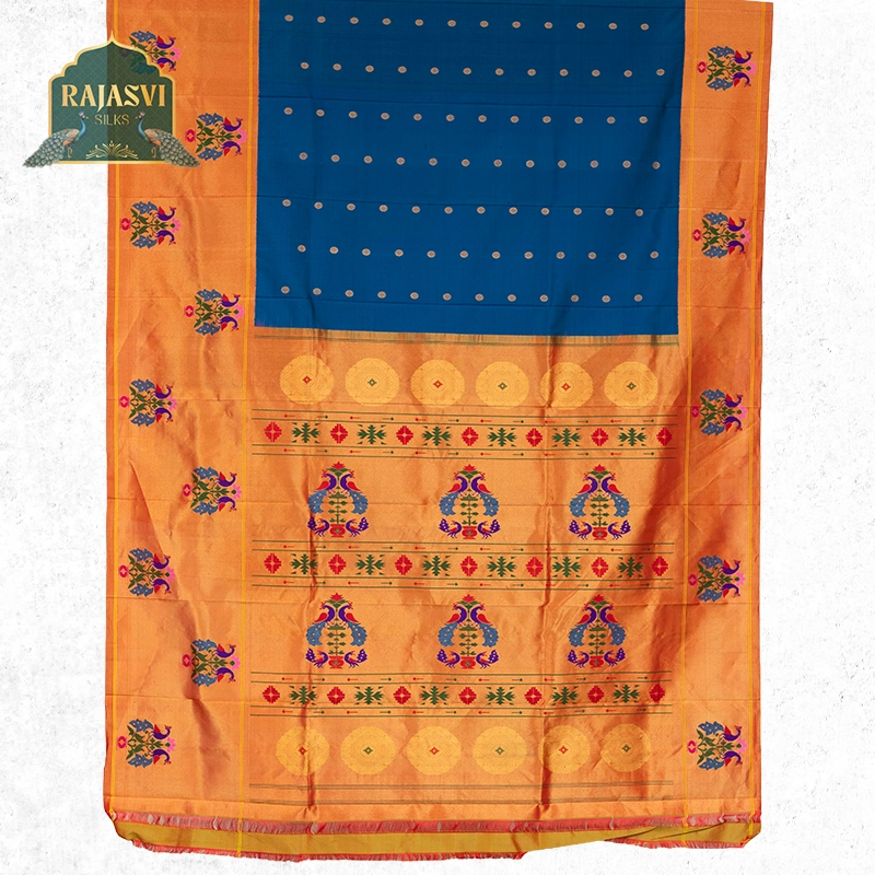 We use only natural, high-quality yarns pure silk and pure cotton to create the rich texture and durability that define a true Paithani saree.
