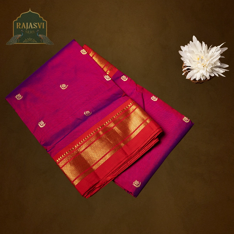 We use only natural, high-quality yarns — pure silk and pure cotton — to create the rich texture and durability that define a true Paithani saree.
